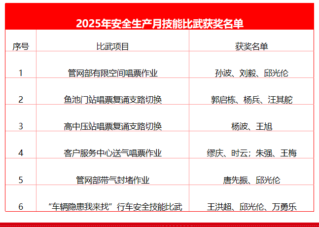 公司圍繞行車安全與燃氣生產(chǎn)運營,開展多樣化比武活動。生產(chǎn)運營方面,管網(wǎng)部、魚池門站、高中壓站及客戶服務中心分別開展了閥門井有限空間作業(yè)、支路切換、送氣安全操作唱票、封堵作業(yè)等比武活動,以實戰(zhàn)化強化“唱票復誦”機制,切實提升一線人員規(guī)范操作水平。后勤保障方面,通過舉辦“車輛隱患我來找”行車安全技能比武,將安全規(guī)范融入操作細節(jié),讓應急能力在競技中淬煉升華。